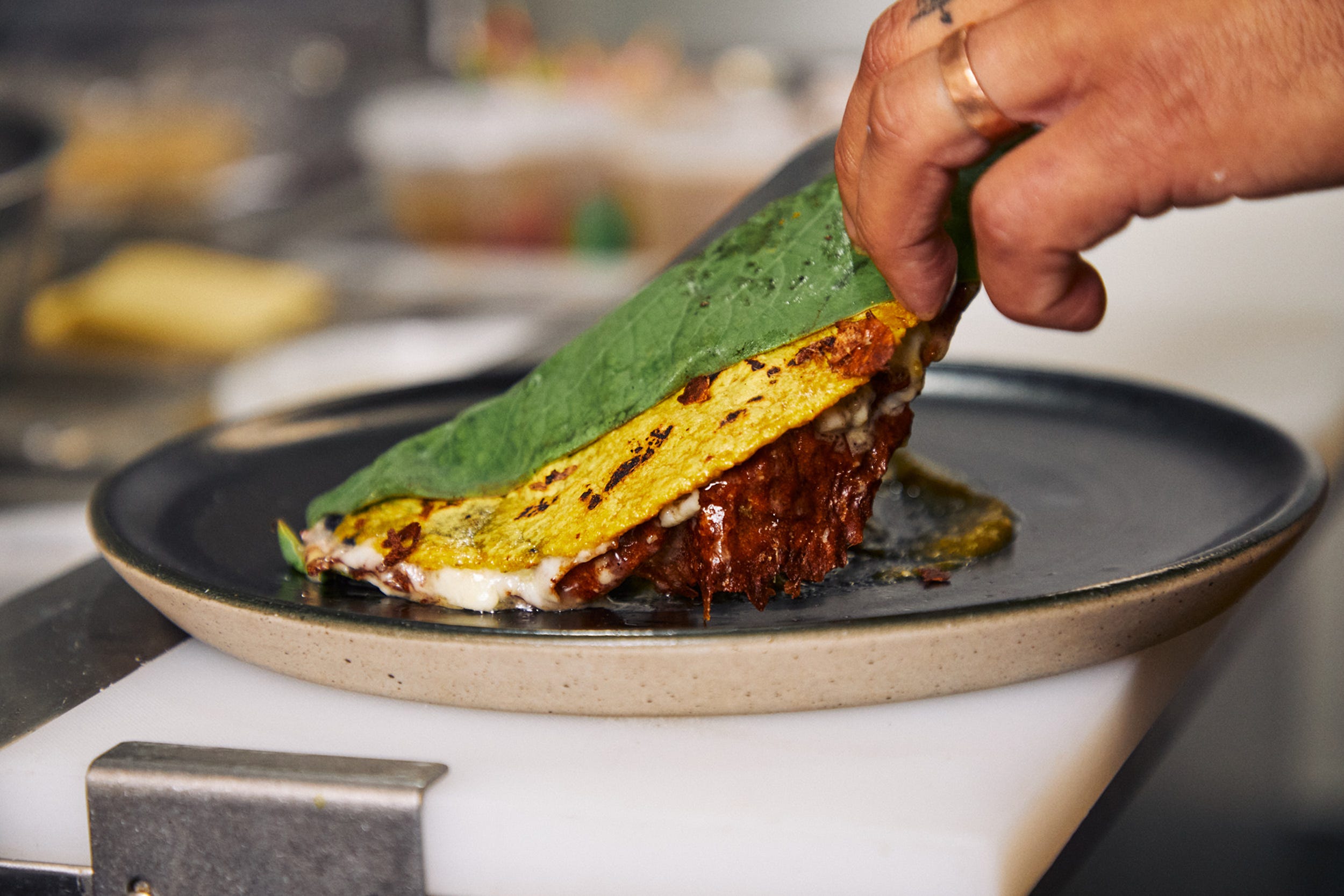 They’re plopped down sometime after the diver scallop tostadas and before the chocolate-y mole recado, a soul-deep aromatic ring of them surrounding impatient cups of miso consommé and vivid red salsa. Emptied shots of unsolicited Hennessy litter the table. One of my dining companions is, somewhat discordantly, biting into a cheesy double smashburger. I’m not even sure if I’m still hungry? But the tacos, beef birria tacos on squid ink tortillas blanketed in queso, are so rich, and gooey, and crunchy, that I’m powerless to stop at just one before the meal is over.